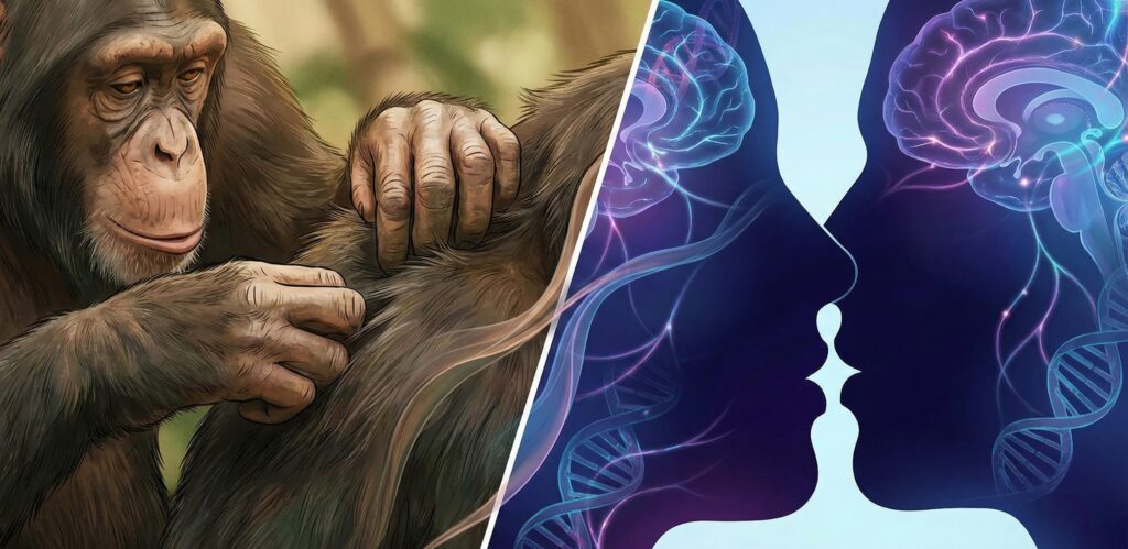 Um den Ursprung des Kusses zu verstehen, müssen wir Millionen Jahre zurückblicken. Unsere haarigen Vorfahren verbrachten einen signifikanten Teil ihres Tages mit „Grooming“ – der sozialen Fellpflege. Das war nie nur Hygiene, sondern der Kitt, der die Gruppe zusammenhielt. Wer gelaust wird, entspannt sich; der Körper schüttet Endorphine aus, der Blutdruck sinkt.